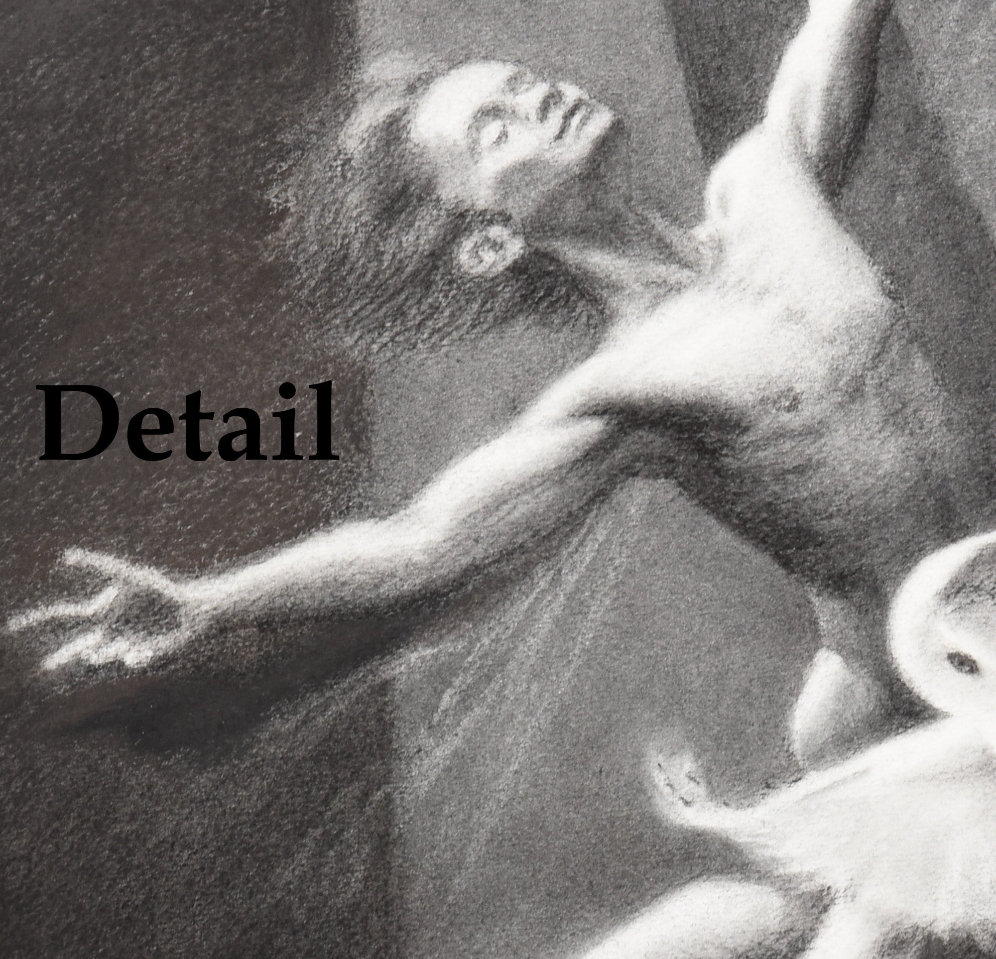 It is a theme that is rarely far from my mind, but this idea of a joyful meeting in the sky of man and bird intrigued me.  Also, with the grays of the striped ceiling acting as a dark background, it made sense to choose a snowy oil to parallel the shapes of the male dancer's extended limbs.