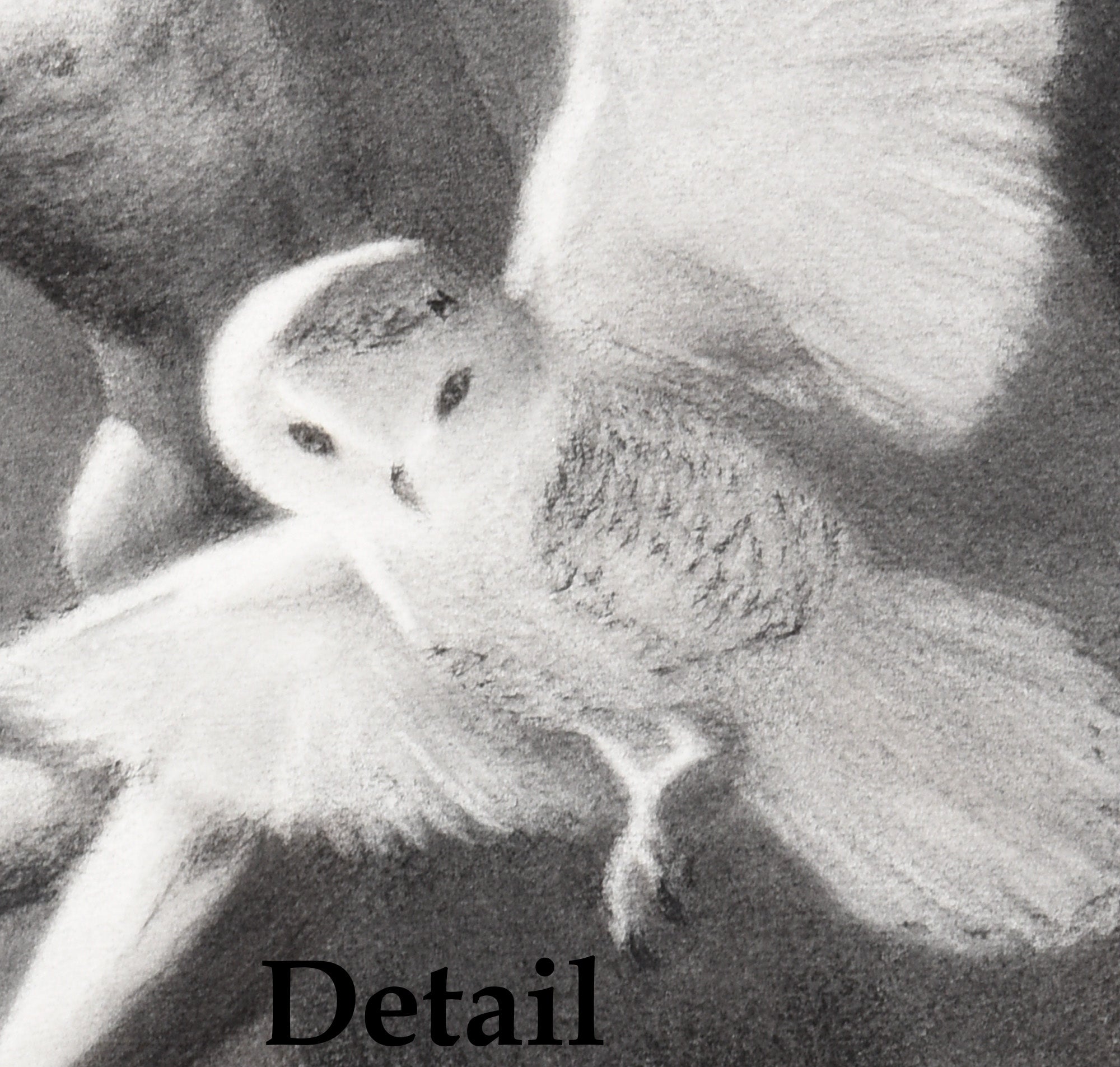 • Charger l'image dans la galerie, Close-up of a snowy owl with detailed feathers and facial features in charcoal drawing by Kelly Borsheim