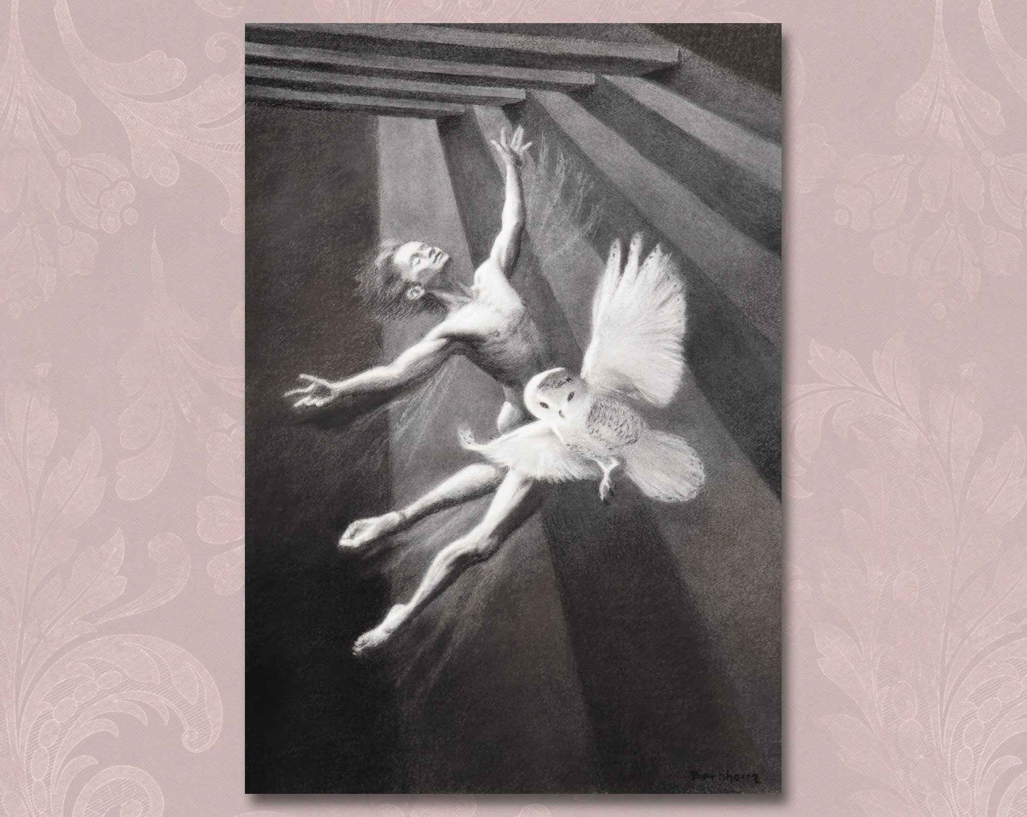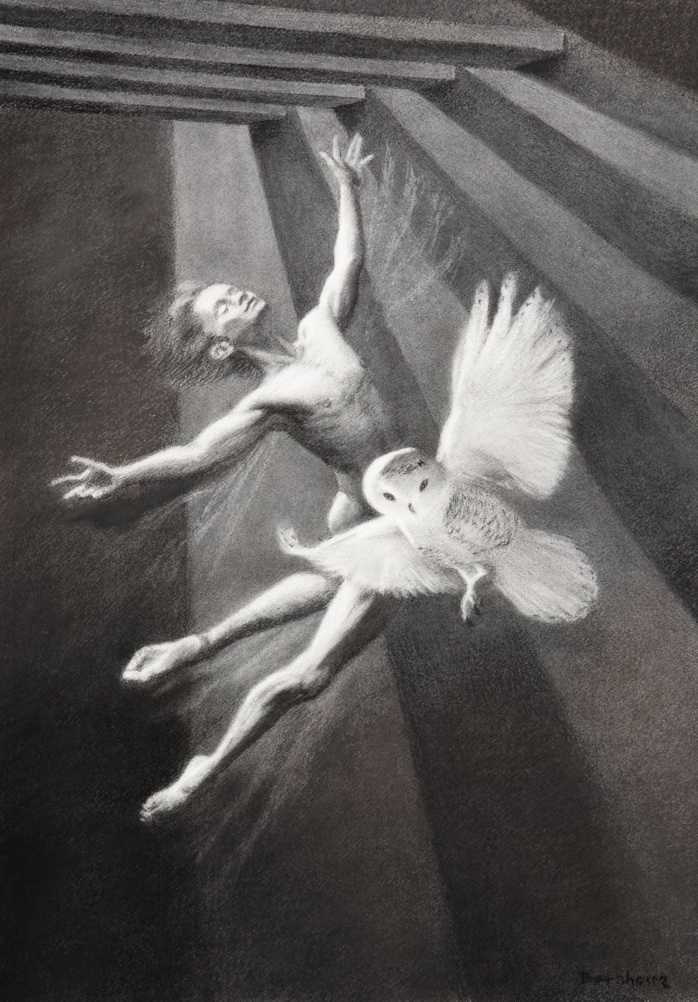 Artistic depiction of a winged creature (snowy owl) with leaping male dancer in flight with a dark background