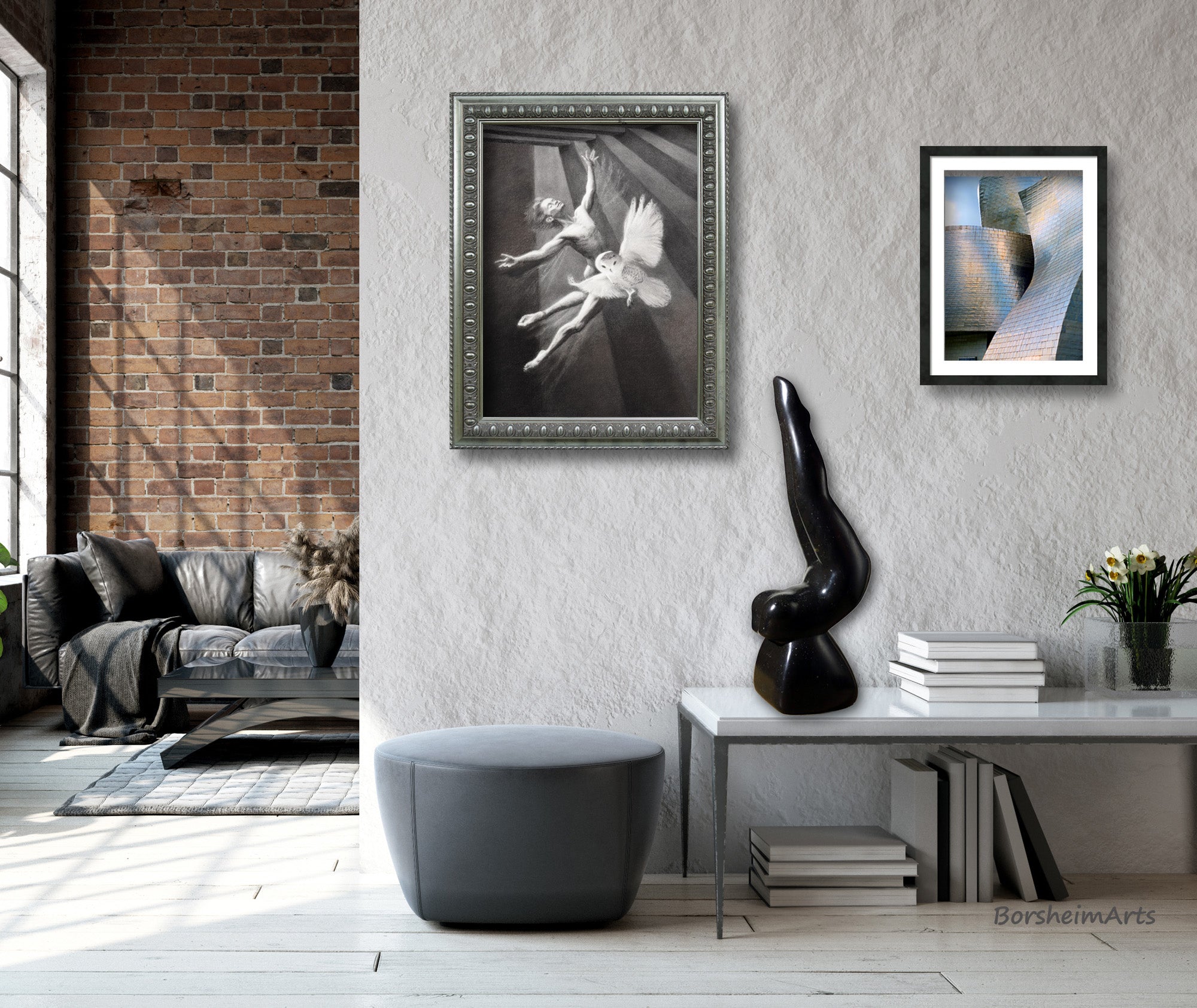 Framed black and white artwork of a dancer an snowy owl on a wall with a red chair and small table.