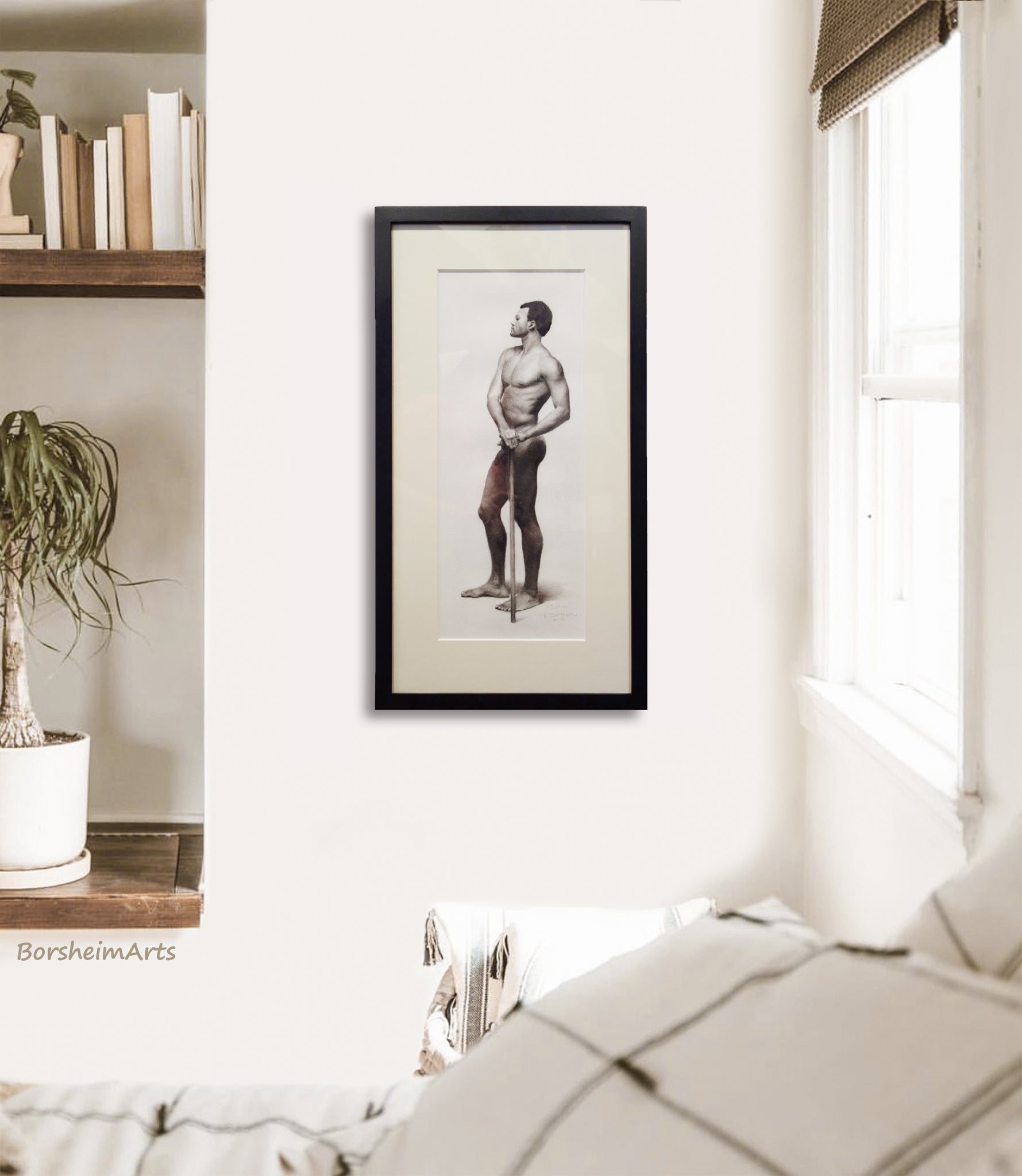 Framed artwork of a shirtless man standing; Original Drawing is exhibited on a wall in a neutral bedroom with a plant and books.